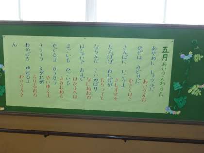 昨年度から、紫明小学校では、全校で詩の音読に取組んでいます。各クラスで毎日声を出して練習をして、朝会や集会で「心を一つに!」を合言葉にがんばっています。「5月のあいうえおうた」は、いつものように、体育館前と南校舎2階の階段掲示板に張り出しています。もう覚えたでしょうか?「あやめに しょうぶだ あいうえお」「かぜは みどりだ かきくけこ」と続いていきます。おうちでも練習していることでしょう。聞いてみてください。リズムがあって楽しいです。