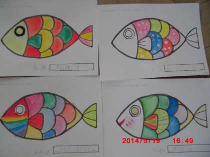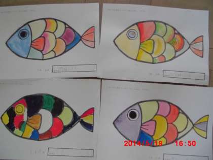 子どもたちは指示をよくきいて活動していました。最後は「おしゃれな魚」という題名で色を塗りました。「えのぐ、めっちゃたのしい〜」と思い思いに作品を仕上げていました。