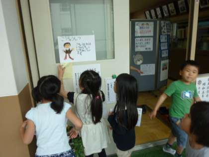 2年生の子どもたちが、学校探検隊として1年生を案内しました。つい1年前に連れてもらっていた子どもたちが、今度は案内をしています。1年ってあっという間です。校長室では、必ず覚えてほしいこと「創立記念日・・・学校の誕生日」を説明していました。歴代の校長先生の写真も興味深く1年生にわかるように話してくれていました。紫明小学校は、今年85周年を迎えます。仲良くできていました。