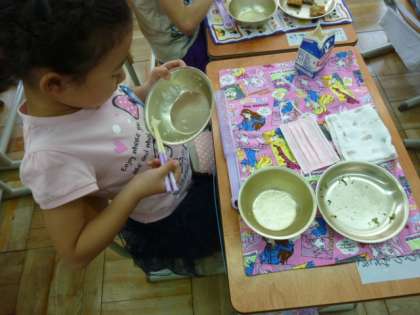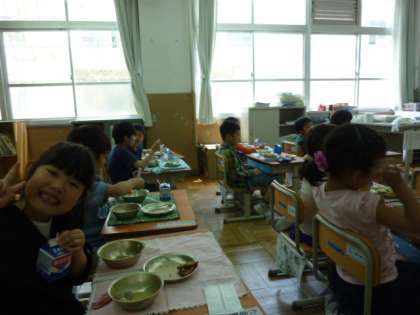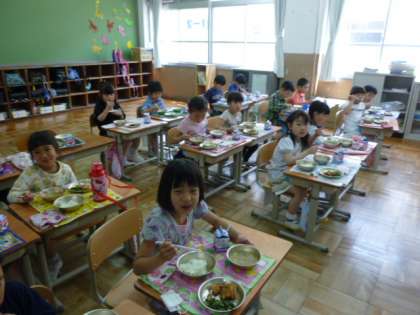 今日は1年2組の教室へ行きました。ご飯の日でした。きれいにきれいに、一粒残らず頑張って食べている様子が素晴らしかったです。三角食べもできていました。えらいです。