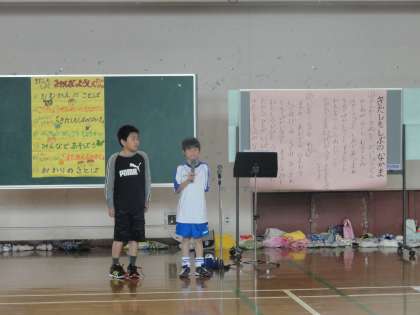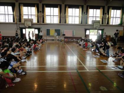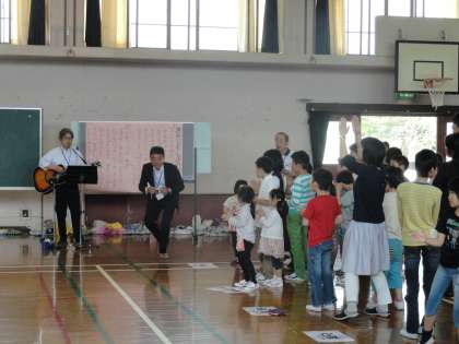 紫明小の全校児童と北下支部(金閣小・衣笠小・大将軍小・柏野小・楽只小・紫野小・附属京都小)の育成学級児童で、交流会をしました。一緒に「北下支部の仲間」を歌ったり、「もうじゅう狩りに行こうよ」などのゲームをしたりしました。最後に紫明小学校の全校児童からゆずの「またあえる日まで」の歌をプレゼントしました。