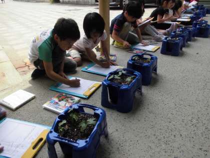 学校の帰りに,自分のあさがおに「はやくおおきくなあれ。」と話しかけている子どもも