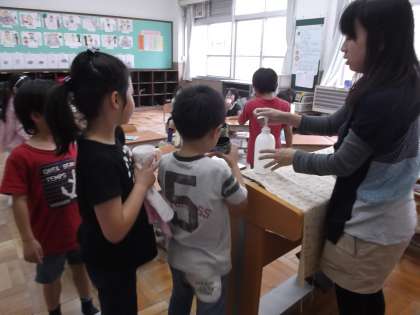 先生からコップにフッ化物を入れてもらい,まずフッ化物やり方の説明を聞き,いざフッ化物を口の中へ!下を向いて前ぶくぶく→右に傾けて右ぶくぶく→左に傾けて左ぶくぶくと上手にできてました。