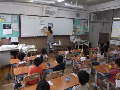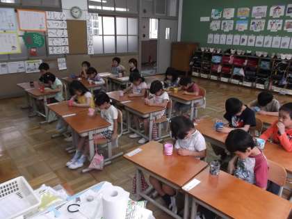 1年生,先週は1分間のぶくぶくうがいの練習をし,今日からフッ化物でのぶくぶくうがいをしました。