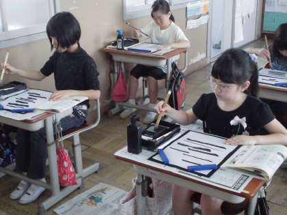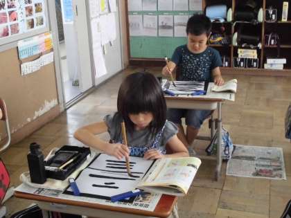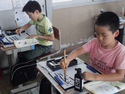 まずは準備の仕方。すずりに文鎮,下敷きなど初めて見る子も多く,ドキドキわくわく。