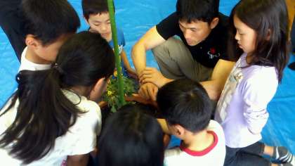 グループに一つ渡されたトマトの苗に,子どもたちは興味津々。