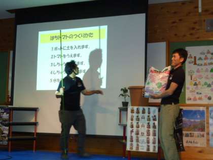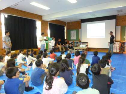 岐阜県JAひだと京都中央市場の方々のご協力で4年生がトマトの栽培に挑戦しました。6月5日にはるばる岐阜県(飛騨高山)から9人そして京都の市場の方々が来てくださいました。飛騨高山でビニルハウスでトマトを栽培されている方からお話を聞きました。長さ50メートルくらいのハウスをいっぱい持っておられて、おひとりで6万本のトマトを育てられているということでした。みんなびっくりしていました。なぜおいしいトマトが育つのかについてのお話では、興味津々でした。今回はグループごとに6つのジャンボ植木鉢に苗を植え、支柱を立てるという実習でした。次回は7月7日、一人一鉢ジャンボ植木鉢をいただくことになります。「それまでの間、京都と岐阜でどれだけ育つか競争だよ。」と話していただきました。花壇の真ん中に置いてあります。4年だけでなくみんなが「早く、大きくなるように・・・。」と見ています。「桃太郎」という品種だそうです。「食育」楽しみです。