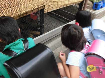 ある日の放課後,1年生がうさぎ小屋をのぞいていました。