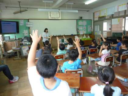 本校には、南校舎の2階に通級教室「スミレ教室」があります。どんな教室なの?そこでどんなことをしているの?など全校へのお知らせが終わりました。スミレ教室の担任が各教室へ行って説明をしました。最後は1年生でした。1年生には、実際にスミレ教室へ行っての説明となりました。木曜日の中間休みには、全児童向けの百人一首タイムをしています。