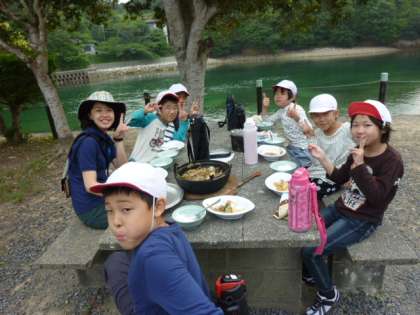 昨夜の野外炊事です。すき焼き風煮においしく作れました。かまど係は、涙をしながら、炎と戦っていました?ご飯もおいしくできました。大成功!