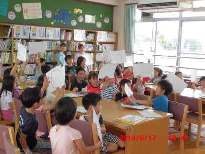 最後は学校たんけんの復習クイズをしました。二年生はクイズの内容を知っていたので,幼児園のみんなが困らないように各教室で丁寧に説明していました。幼児園のみんなも答えが合っていると「いえー」ととても喜んでくれていました。それを見て,二年生もニコニコしていました。