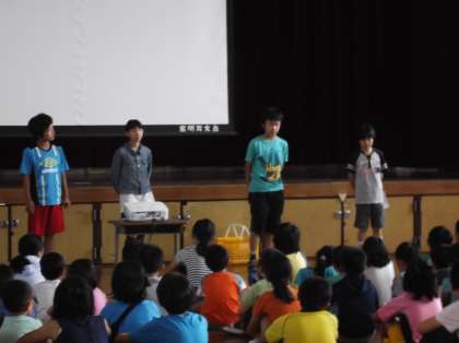 児童会朝会で,健康委員会の取り組みについて発表しました。