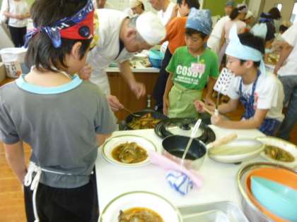 展示学習のほかに、6年生は、サバの3枚卸に挑戦しました。最初に学習会があり、水産協会の会長さんから、魚の流通やセリの時の指で値段を表す方法、魚の栄養などのお話がありました。そして、京都魚菜鮓商協同組合の方々が13人来ていただきました。6班に分かれ、プロの説明を受けながら料理をしました。包丁の持ち方、サバの内臓の取り方、3枚卸の仕方など、直接教えていただきました。保護者の方々も参観していただきました。サバのゆうあん焼き・サバの野菜あんかけを作りました。ちょっとプロの料理人になった気分でした。丁寧に教えていただき本当にありがとうございました。これから、サバを見たらきっと今日の日のことを思い出してくれることと思います。家でもチャレンジしてみてください。