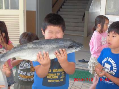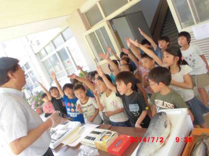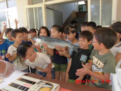 6年生の学習にともなって中央市場の方々が新鮮な魚をたくさん持ってきて展示してくださいました。お魚クイズに,あゆのつかみ取りや,たこの吸盤を触ったり,じゃこの試食をしたりとても楽しい時間でした。