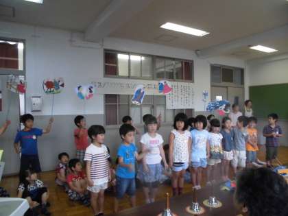 笹飾りを作って,笹にくくりつけた後は,一緒に歌ったり,ミュージックベルの演奏を