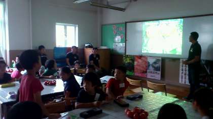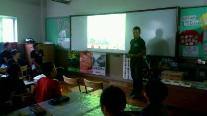 飛騨の農家の方に来ていただいて,トマトの育て方を教えていただきました。一か月ほど前に苗を頂いて,グループで育てていました。