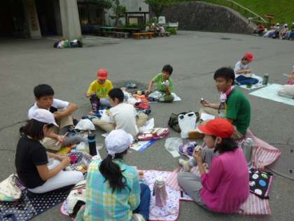 いよいよお弁当です。ちょっと早いですが、今なら外で食べられそう。みんなにこにこ!元町小学校の友達との話も盛り上がります。