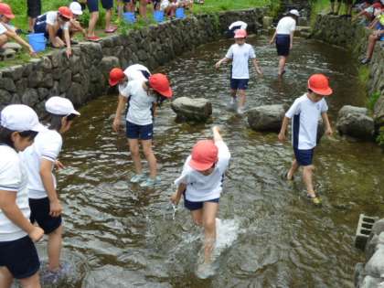 今日は、魚つかみです。イワナが登場しました。ぬるぬるする!逃げるのがはやすぎる!と大賑わいでした。一人1っ匹ずつとにかくつかむことができました。そして料理です。