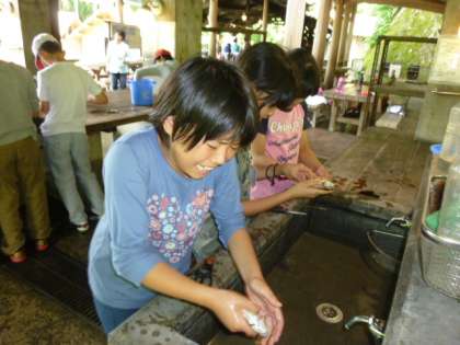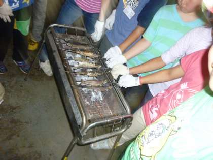 ついにイワナを料理することになりました。「キャーできるだろうか?」「クニュクニュしてる!」とイワナと戦っていました。初めての経験の子がほとんどでした。焼き立ては最高においしかったです。今日山の家から出した家族へのはがきには、たくさんこの魚のことが書いてありました。お楽しみに!