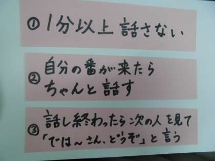 3.話し終わったら,次の人を見て「では〜さん,どうぞ」と言う