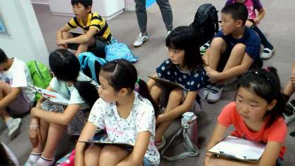 京都のいろいろな企業の紹介ブースの案内を受けているところです。子どもたちはどの企業を調べようかとわくわくしながらお話を聞いていました。