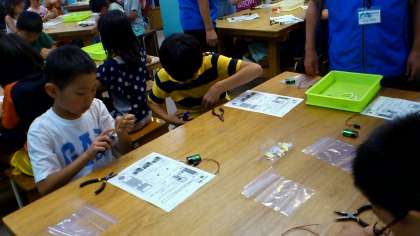 モノづくり学習2時間目は,ロームの研究職の方に来ていただいて,LEDとコンデンサを使ったモノづくりをしました。