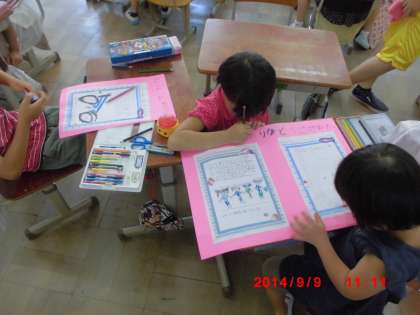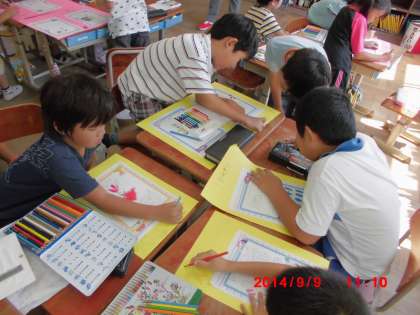 インタビューに協力していただいた方々にお礼の気持ちを伝えよう,ということで,手紙を書きました。今日は手紙を渡して直接「ありがとうございました」と伝えました。また,春とは違う様子を見つけようという めあてで 町探検もしました。気温や音、植物,お店のものなどいろいろなことに気づいていました。