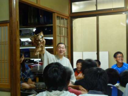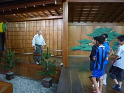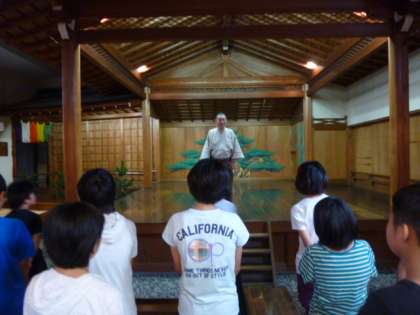 7月に6年生と一緒に狂言の勉強をしました。「柿山伏」です。そのまとめとして、どんなところで演じるのかということで能舞台の見学に行ってきました。今出川にある、河村能楽堂でお世話になりました。どのようなつくりになっているのか、実際に舞台にあがらせていただきました。つるつるに手入れされていることもわかりました。能のお話も聞かせていただき、お面も見せていただきました。本物に触れることができ、みんな真剣に聞いていました。河村さんありがとうございました。