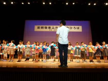 9月14日に北文化会館で「紫明敬老ふれあいひろば」が行われました。毎年、本校の3年生と4年生がステージに上がります。全校児童が地域の方々へお手紙を書きました。6年生の代表が開会のセレモニーで、挨拶とともに渡ししました。3年生と4年生は、歌で「花のおくりもの」「お陽さまになって」の2曲を披露しました。会場から大きな拍手をいただきました。がんばりました。