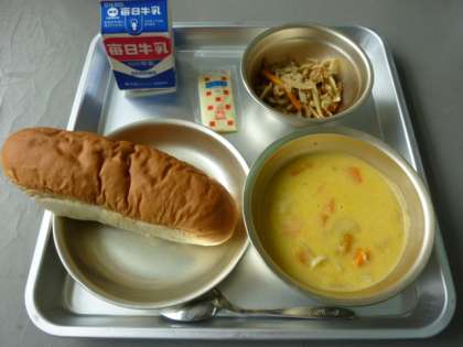 9月12日は「チキンカツ」でした。大人気です。お味噌汁にはわかめと麩が入っていました。16日は、肉みそ炒めでした。大豆もたくさん入っていました。17日は、パンプキンチャウダーでした。チャウダーは、アメリカで生まれたとろみのあるスープです。かぼちゃの甘みがおいしかったです。