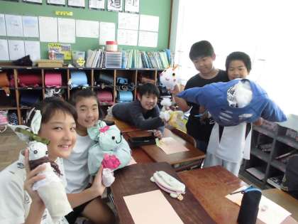図工「布から生まれた形」を学習しました。いらなくなった洋服や手袋などの布製品をつかって,しばり技や縫い技,つめ技,組合せ技などの様々な技を使って,作品を作り上げました。