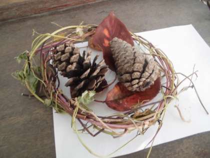 拾った松ぼっくりをリースの中に入れています。