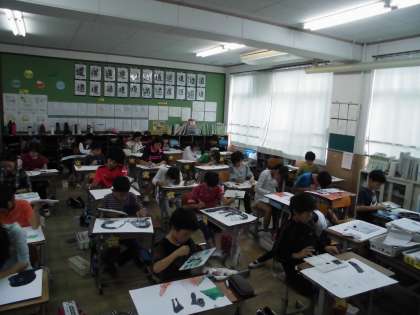 お話の絵に取り組んでいます。5年生の本は「野生のゴリラと再会する〜二十六年前のわたしを覚えていたタイタスの物語〜」です。ゴリラの世界に留学した作者の体験を想像し,思い描きました。