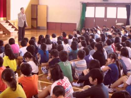 最後に,大きなボールを紫明小学校に見立て,その上に子ども達に見立てた小さなボールを重ね,舞台の上から一緒に落とされると,小さなボールは,驚くほど大きく跳ねました。「皆さんも,このように,ここから大きく羽ばたいていってください。」と心のこもったお言葉をいただきました。