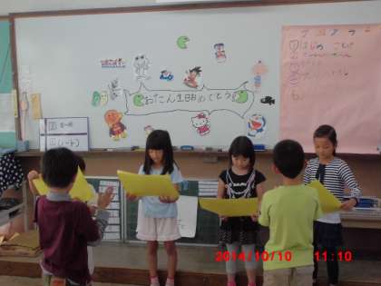 新しいかかりさんが,おたん生日会を企画運営してくれました。はじめの言葉では「おめでとうの気もちをもって たのしみましょう」とみんなに声をかけてくれました。