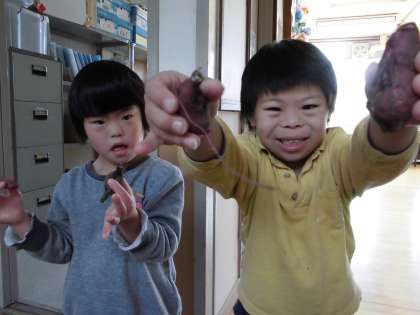 春から育てていたさつまいもを掘りました。昨年度よりも夏の気温が低かったせいかとても小さかったですが、たくさん採れたお芋を手に取って嬉しそうにしていました。