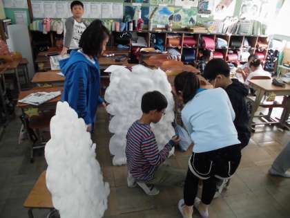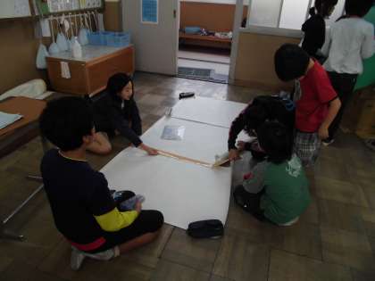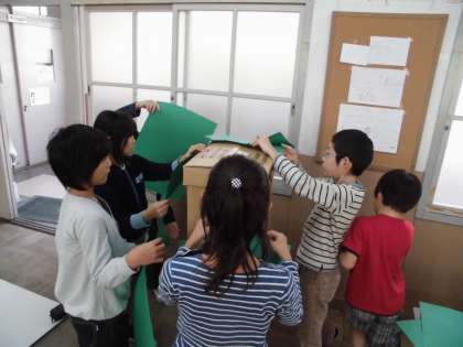 学芸会に向けて,大道具や小道具作りをしています。自分たちで「作ってみたい!」という思いをもっていたので,役割分担し,協力して進めています。少しずつ背景やクリスマスツリー,衣装などが形になってきました。