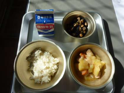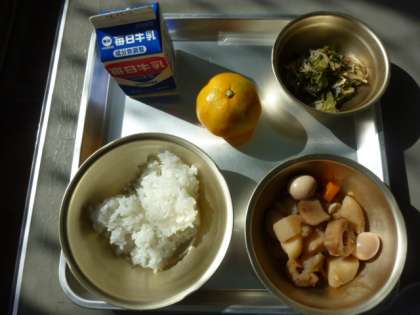 10日の給食は、鶏肉と野菜の煮つけ・ひじきまめ・麦ごはんでした。11日の給食は、関東煮・もやしと小松菜のごまいため・ごはんそしてみかんがついていました。今では、1年中食べられる小松菜ですが、もともとは、冬が旬の野菜です。「冬菜」とよばれ、冬は、甘みが多いようです。おいしかったです。ご家庭でも話題にしてみてください。