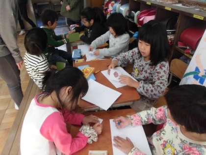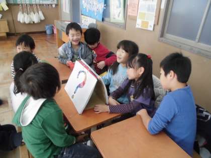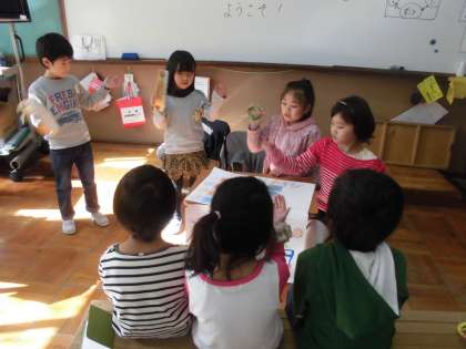 国語・算数・図工・音楽の4グループに分かれて,小学校でのお勉強をすこし体験してもらいました。
