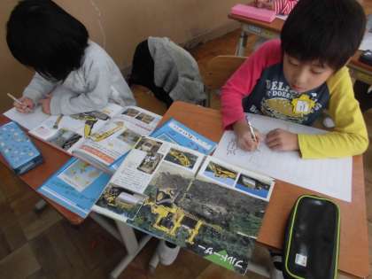 学校の図書室の本だけでなく,北図書館からもはたらく車の本を借りています。