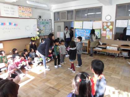 最後は,歌とどんぐりの飾りを紫明幼稚園のみなさんにプレゼントして,
