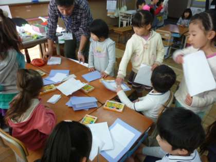 昨年度から、保育園と幼稚園の交流を学習活動の中に組み入れました。2年生が上総保育園の年長さん、1年生が学校の向かいにある紫明幼稚園の年長さんと交流をしています。招待した後は、各園に招待されるという形をとっています。2年生はすでに実施しました。いよいよ1年生の日がやってきました。朝から、ひょっとすると前の晩から?「年長さんが来てくれるんだ?」と張り切っていたんだと思います。学校の探検や、学習の様子、おはじき数えやリズムうち、クレパスを使ったりとブースに分かれて楽しく交流していました。お兄さんお姉さんになっていました。生活科の時間を通して新しい1年生にも紫明小学校の楽しいことをいっぱい教えてあげたいという気持ちが感じられました。あったかい時間になりました。