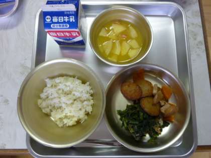 11月17日の給食には、新献立「オレンジアップルン」が登場しました。リンゴをいちょう切りにしてオレンジジュースと一緒に煮た後、寒天で固まるようにしてあります。シャキシャキとしたリンゴの食感を楽しみました。18日は、なまぶしと厚揚げの煮つけでした。すまし汁には、かまぼこが入っていました。おいしかったです。
