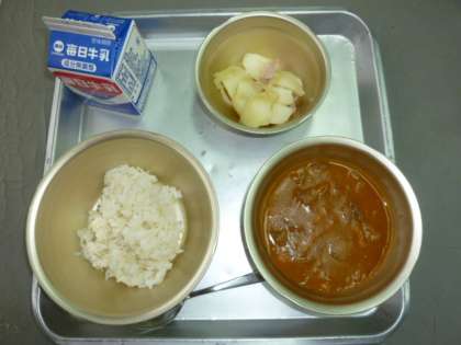 12月4日の給食は、ハッシュドビーフとジャーマンポテトと麦ごはんと牛乳でした。ドイツでは、じゃがいもを使った料理がよく食べられているそうです。