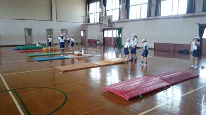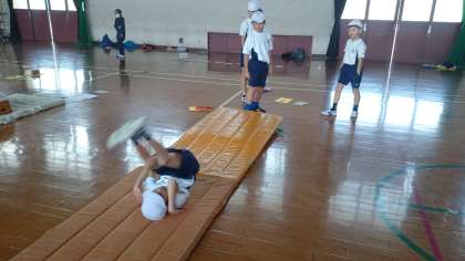 体育の時間にマット運動をしています。できる技で連続に挑戦。頑張ったらできそうな技に挑戦しています。意欲的に活動して、できる技を増やそうと頑張っています。友達とアドバイスし合う姿も素敵です。