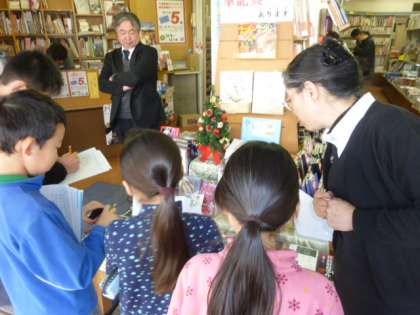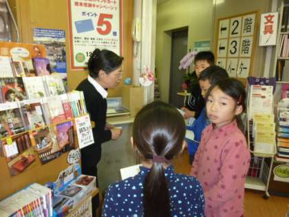 書店にもインタビューに行きました。店内は、どのような工夫がされているのかやお仕事に対する思いなどを聞いていました。2階や3階にも上がって店内の様子を調べていました。みなさん、子どもたちの質問に根気強く聞いていただき本当に感謝しています。素敵なパンフレットができましたらお届けしたいと思います。
