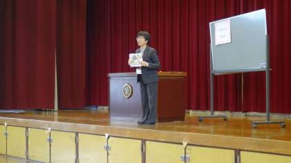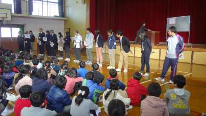 「あけましておめでとうございます。」元気いっぱいの声で、今年の朝会がスタートしました。こんな1年にしていきたいと目標を立てることも大切です。みんなが大好きな紫明小学校になるように一人一人が頑張っていきましょうと話しました。そのあと、イングリッシュうシャワーの時間をもちました。校長室は?理科室は?階段は?それぞれ養護の先生は保健室・図書に関わってもらっている先生は図書室・いつも学校の約束やトイレのスリッパのことを話す先生からは、トイレなどそれぞれに関係のありそうな?カードを一人一人がカードを見せながら英語ではどういうかを発表しました。子どもたちはその発音を頼りにみんなが声を合わせて繰り返しました。楽しい時間となりました。