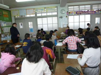 5年の教室では、冬休みの思い出をクイズに表してみんなで答えながら、発表していました。雪がいっぱい降ったので鴨川で「かまくら」を作りました。次の日も気になるので「かまくら」を見に行きました。どうなっていたと思いますか?みんな真剣に考えていました。