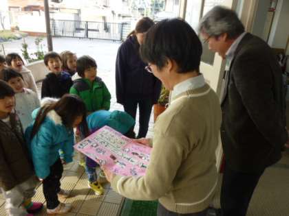 1月8日にかわいいお客さんが紫明小学校に来てくれました。紫明幼稚園の年長さんです。「あけましておめでとうございます。今年もよろしくお願いします。」と元気いっぱいに挨拶をしてくれました。かわいい心のこもったカードも届けてくれました。ありがとうございました。職員室の横に掲示しています。2月17日は半日入学・入学説明会です。
