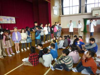 ウサギはどうして耳が長いの・歯は何本あるの・どれくらい生きられるの・オスとメスはどんな違いがあるの・心臓の音は・体の骨はどんなふうになっているのなど、いっぱいウサギの秘密を教えていただきました。せっかく申し込んでいたけれど、風邪で参加できなかった人もいました。参加した人がいっぱい教えてあげてください。最後の感想発表会では、「ウサギの心臓の音がとても速かった!」と話している子どもたちがいました。一人一人が聴診器を使って確かめました。保護者の方々にも心音を聞いていただきました。貴重な体験ができたと思います。これからもウサギと仲良くしていきましょう。